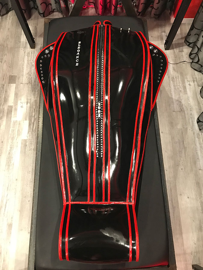 Ein Latextraum erfüllt sich für Dich! Du kennst das Gefühl, in einem Bondagesack eingeschlossen zu sein? Das ist nichts gegen das Erlebnis, den Latex-Sarkophag zum ersten Mal zu benutzen. Mit zwei separaten Luftkammern wirst Du das Gefühl verspüren, im Latexhimmel zu schweben und doch ist dieser Sarkophag ausbruchsicher gestaltet und auch für Langzeitaufenthalte geeignet. An den Seiten sind zwei Smellbags angebracht, die nach Belieben mit dem Kopfteil verbunden werden können.
