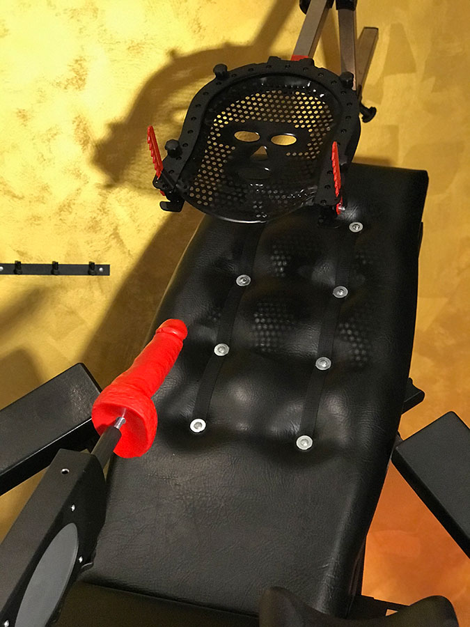 Diese Latex Gesichtsmaske kann an einer Vielzahl unserer BDSM Möbel angebracht werden, vom Gynstuhl über den Sklavenstuhl bis hin zur Bonde Liege.